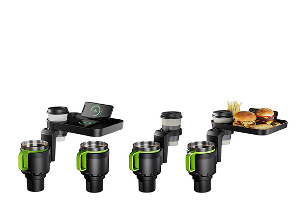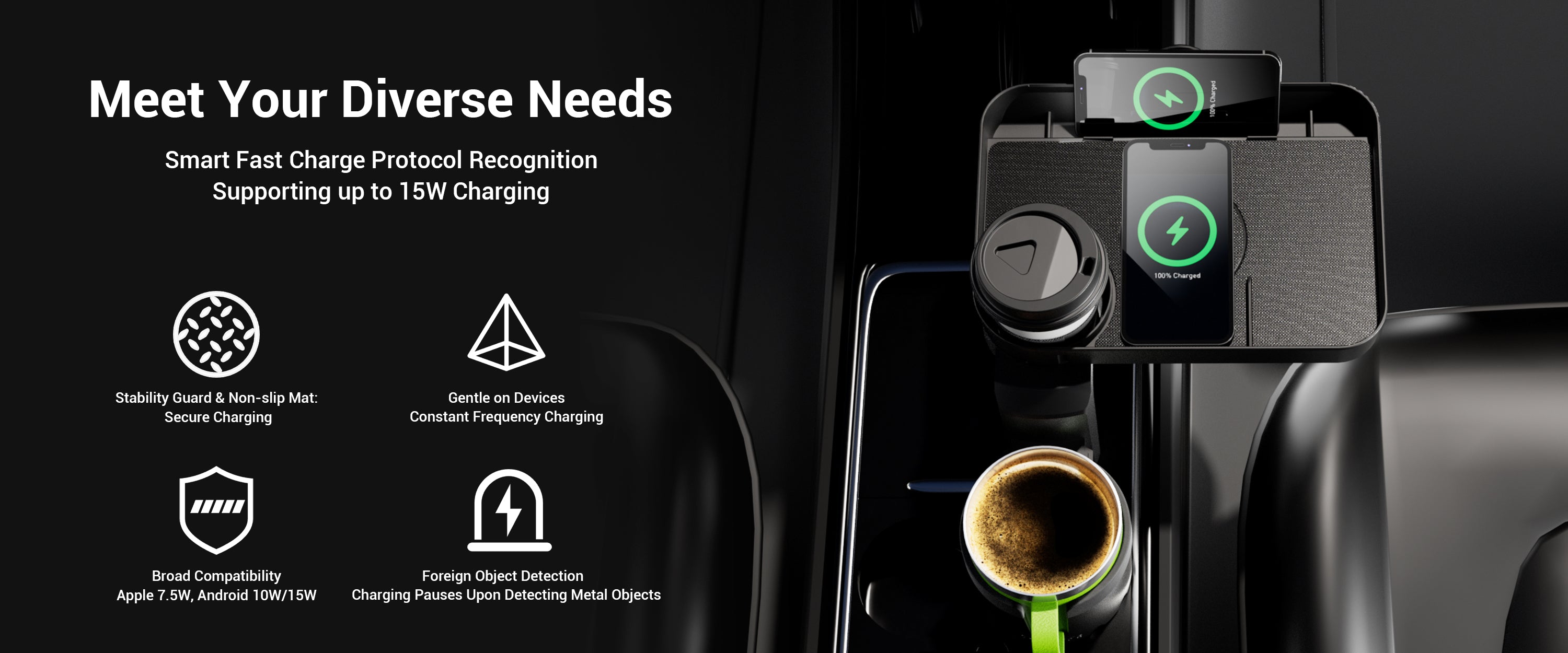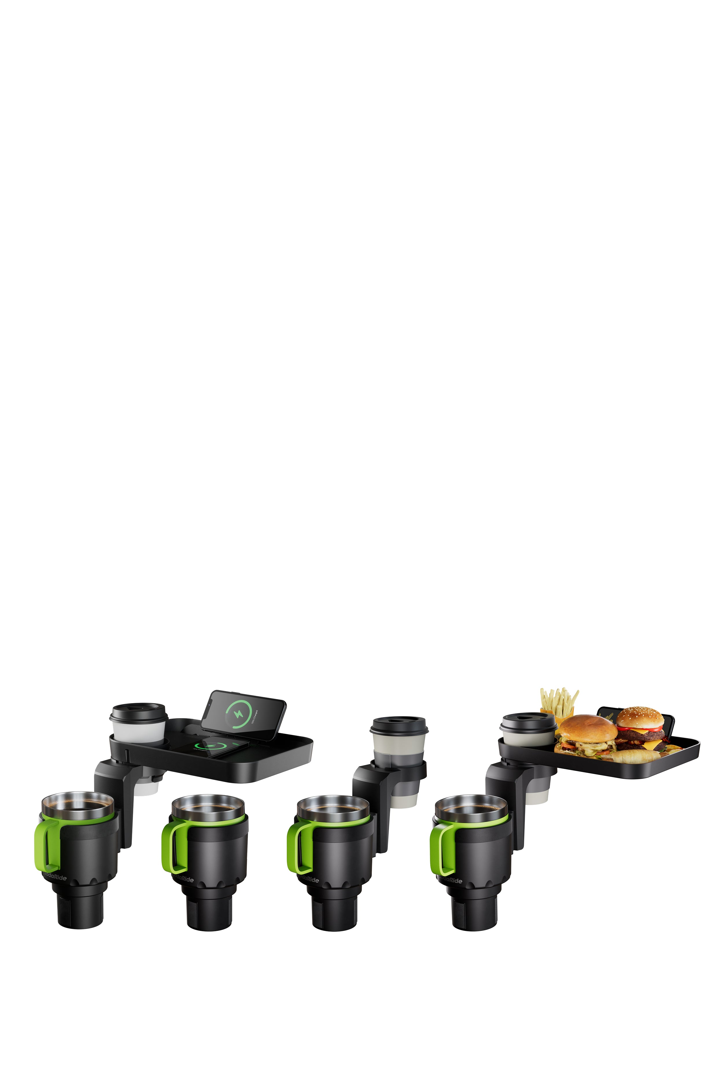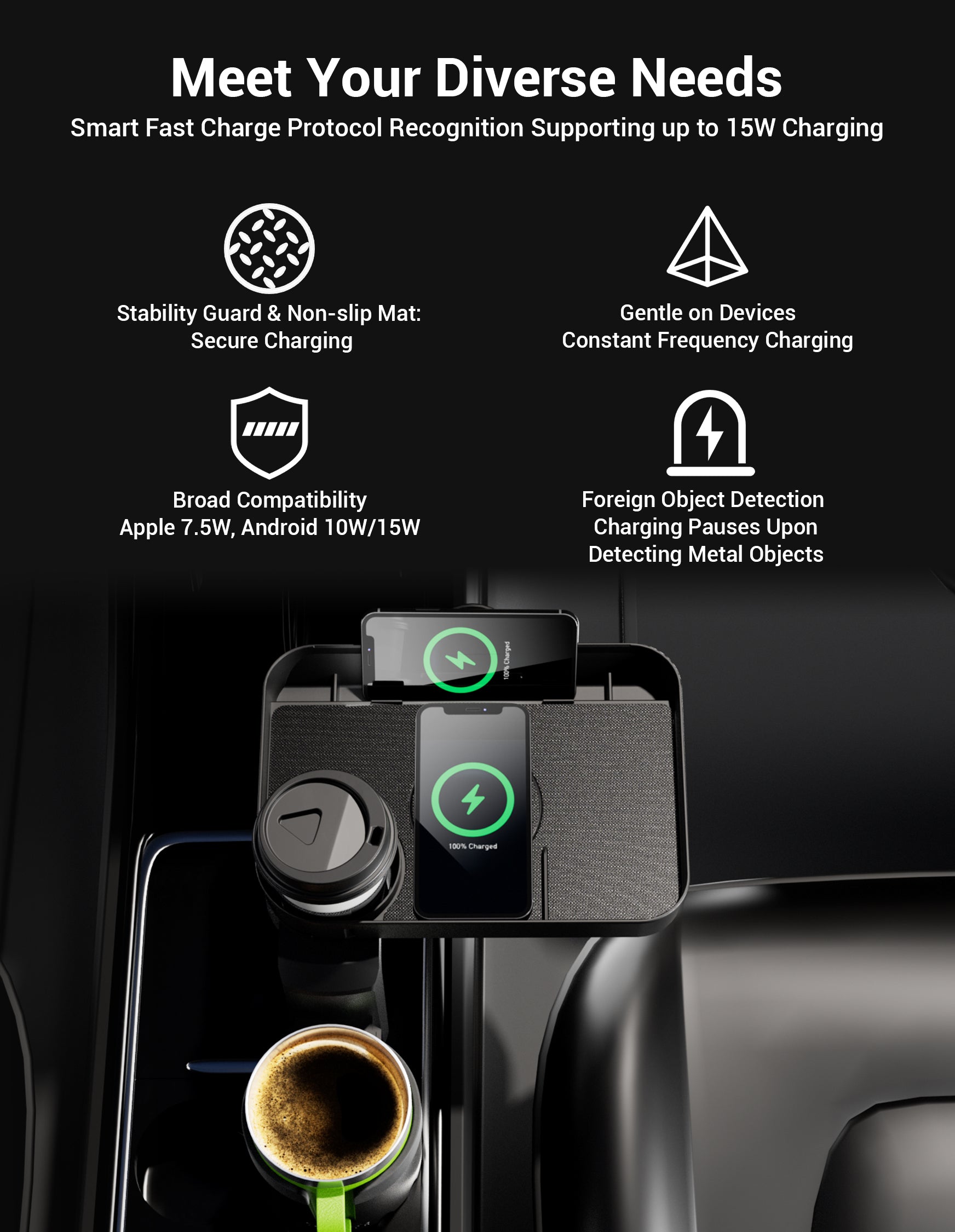 Unmatched Flexibility: The 4-in-1 cup holder is a space-saving accessory that functions as either a single or dual cup holder and doubles as a food tray with wireless charging capabilities. Whether streaming movies or gaming, keep your devices fully charged and securely in place with our stability guard and non-slip mat.