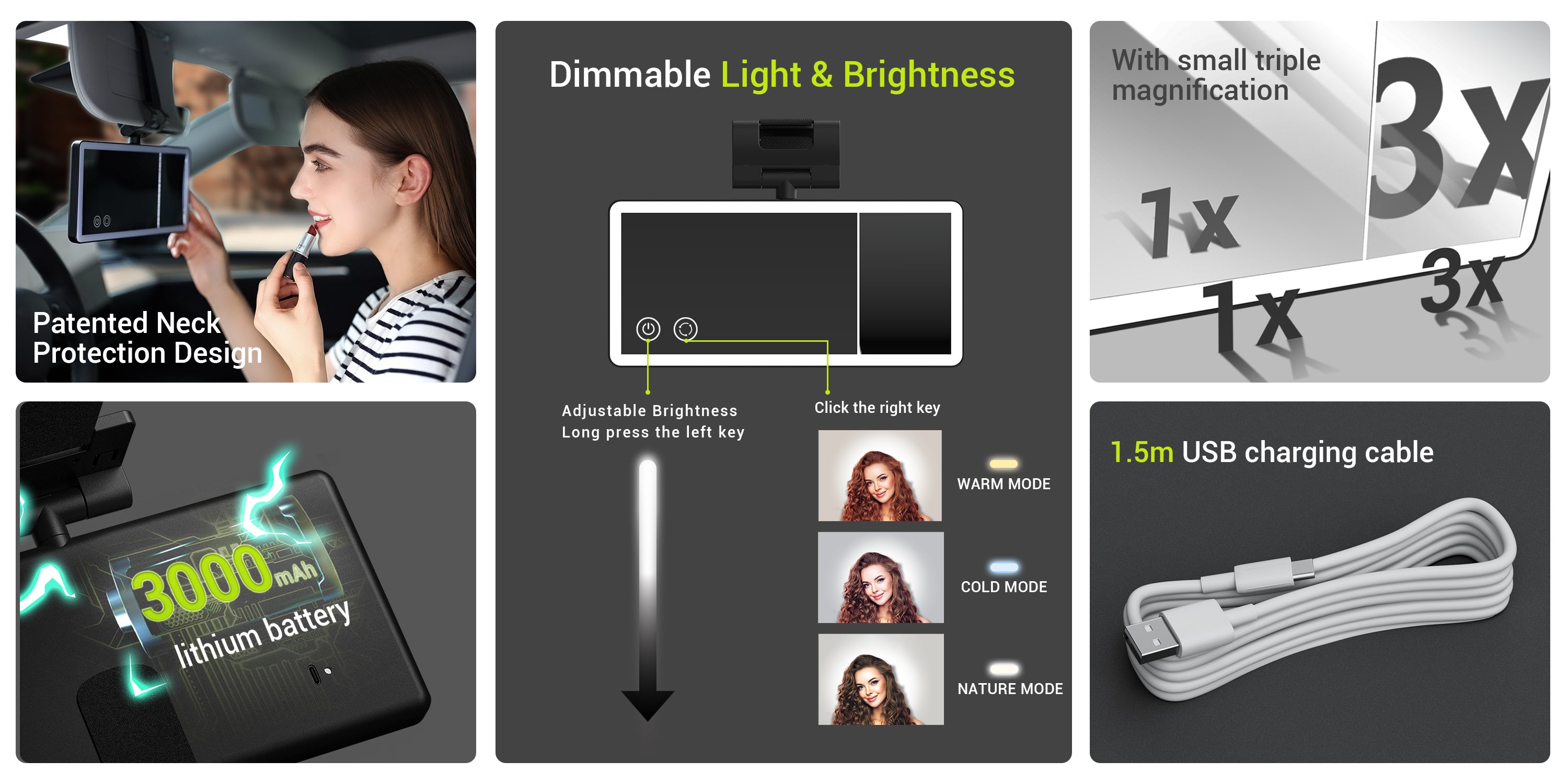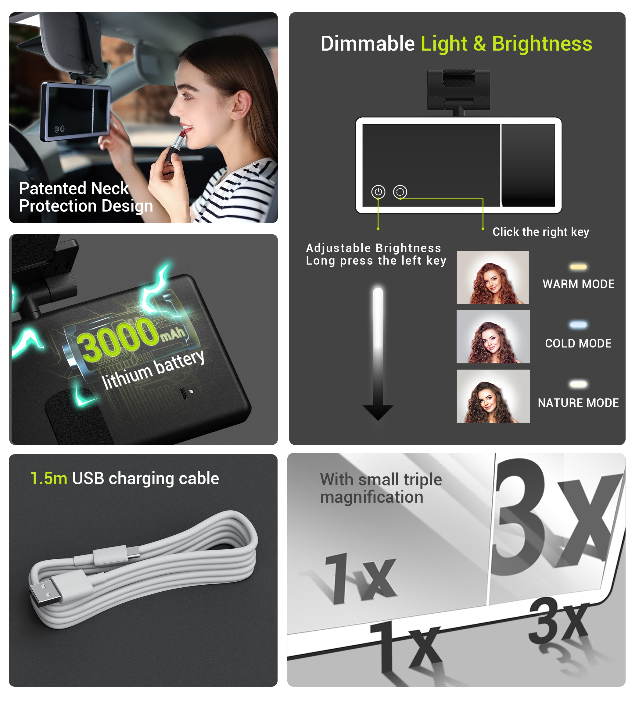 Dimmable Light Color & Brightness: Car visor mirror has 3 light modes, cold, warm, nature, light color can be adjusted according to your needs. Light brightness can be dimmed or intensified by long pressing the ON/OFF button.
